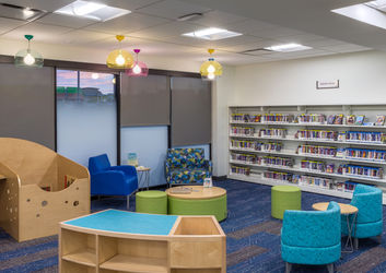 The Barkman and Lucero Branches sit 2 miles apart but serve communities that differ greatly in terms of demographics and socio-economic characteristics. Both branches have received a small addition that will provide new meeting rooms with after-hours access. The updated layouts house noisier spaces near the door and quieter spaces deeper into the building. Interior palettes are based on subdued nature motifs. Mobile book displays, lowered shelving, content creation technology, and improved functionality are hallmarks of both buildings.