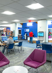 The Barkman Branch is adjacent to a community park with good visibility between the two. A new outdoor plaza will extend programming and an expanded parking lot will increase usability of the site. This branch currently utilizes an AMH system at the exterior book drop which will move closer to the entry with staff work areas being reconfigured for improved efficiency. Two enclosed study rooms will be added for focused work / study and laptop lending will be offered to reduce the amount of fixed computer stations instead providing added options for seating.