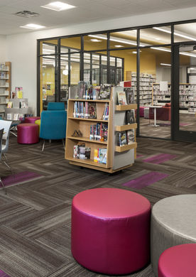 Open collection spaces that co-mingle shelving with seating and technology promote browse-ability. Raised access flooring in these spaces provides for long-term flexibility. A covered front porch serves as an extension of the library’s adult reading area while a patio and children’s garden provide additional youth program space. The inclusion of an automated material handling system simplifies staff workflow allowing the librarians more time on the floor interacting with patrons.
