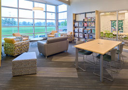 The North Branch renovation brings a new layout to the existing 2-story building. Modern finishes are used to create a brighter interior while adapting the unique architecture of this building. Mobility is incorporated both in the service points and in the updated Business Center. Graphic window film is used to bring a sense of privacy to the glassy and technology-rich enclosed study rooms. Existing lighting was replaced with energy-efficient fixtures. Staff work areas have been renovated for improved functionality and efficiency. The lower-level meeting room has also been updated with new finishes and collaborative technology.