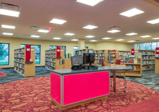 A transitional space housing glass-enclosed study rooms and a maker space leads from the existing portion of the building to the addition. The addition features a quiet Adult Collection and reading area to one side and a new Children’s Area to the other. The Children’s Area features an O-H-I-O early literacy interactive element and a collaboration with DIRTT helped to create an interactive technology wall. The building also features a 24 / 7 vestibule with access to after-hours lockers and under-carpet wiring for future flexibility.
