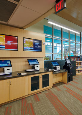 This project centers around two additions and the renovation of an existing 17,370 SF branch library that has distinguishable wings which house a children’s area in one and a large, flexible meeting room and cafe space in the other. A new East addition of a growing, curved glass facade provides a contemporary visual connector running North to South along the building. This also opens clear sight lines upon entry to the expanded Children’s Area, updated Meeting Room, Adult areas, Study Rooms, Staff Service Point, and new book displays. Passers-by and Library patrons now have more visibility into and out of the Library provided by the new glass facade, replacement of existing tinted glass, and opening up existing, hidden windows for more natural light.