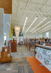 We began this project with a series of collaborative input sessions that resulted in an overwhelming response to creating a new library that would relate to the scale of the historic downtown and form an entryway while acting as a modern icon and destination. We developed a series of vignettes showing development of the building form taking shape and shared these with the community throughout the design process. It was through these meetings that bold color backed by a combination of neutral brick and corrugated metal became the exterior palette for the Vinton Branch. The exterior architecture is carried inside the building through ceiling forms and color accents that create visual pathways and define areas for seating, browsing, and gathering without fixed walls.