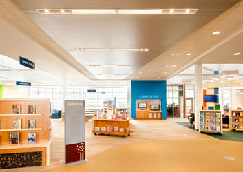 This branch library is co-located on the same site as a new YMCA facility and town hall building creating a new civic destination point for this community. HBM worked with the city and the firm designing the YMCA to coordinate site features, orientation, and create a unified frontage along the main road. This project was also the host location for Library Journal’s Design Institute event in December of 2012. This was the first time the event was held at a branch library instead of a large downtown main library due to comparable and flexible meeting space.