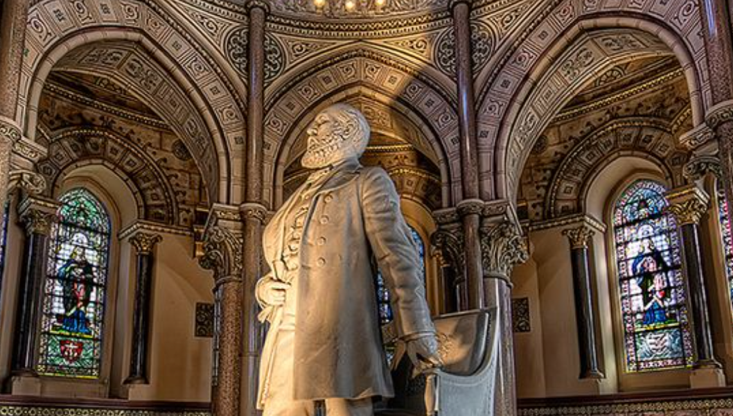 The Memorial Hall includes rich, gold mosaics, beautifully colored marble, stained glass windows and deep-red granite columns. The stained glass windows and window like panes represent the original 13 colonies, plus the state of Ohio, along with panels depicting War and Peace. Standing in the main floor is a statue of the President sculpted by Alexander Doyle.
