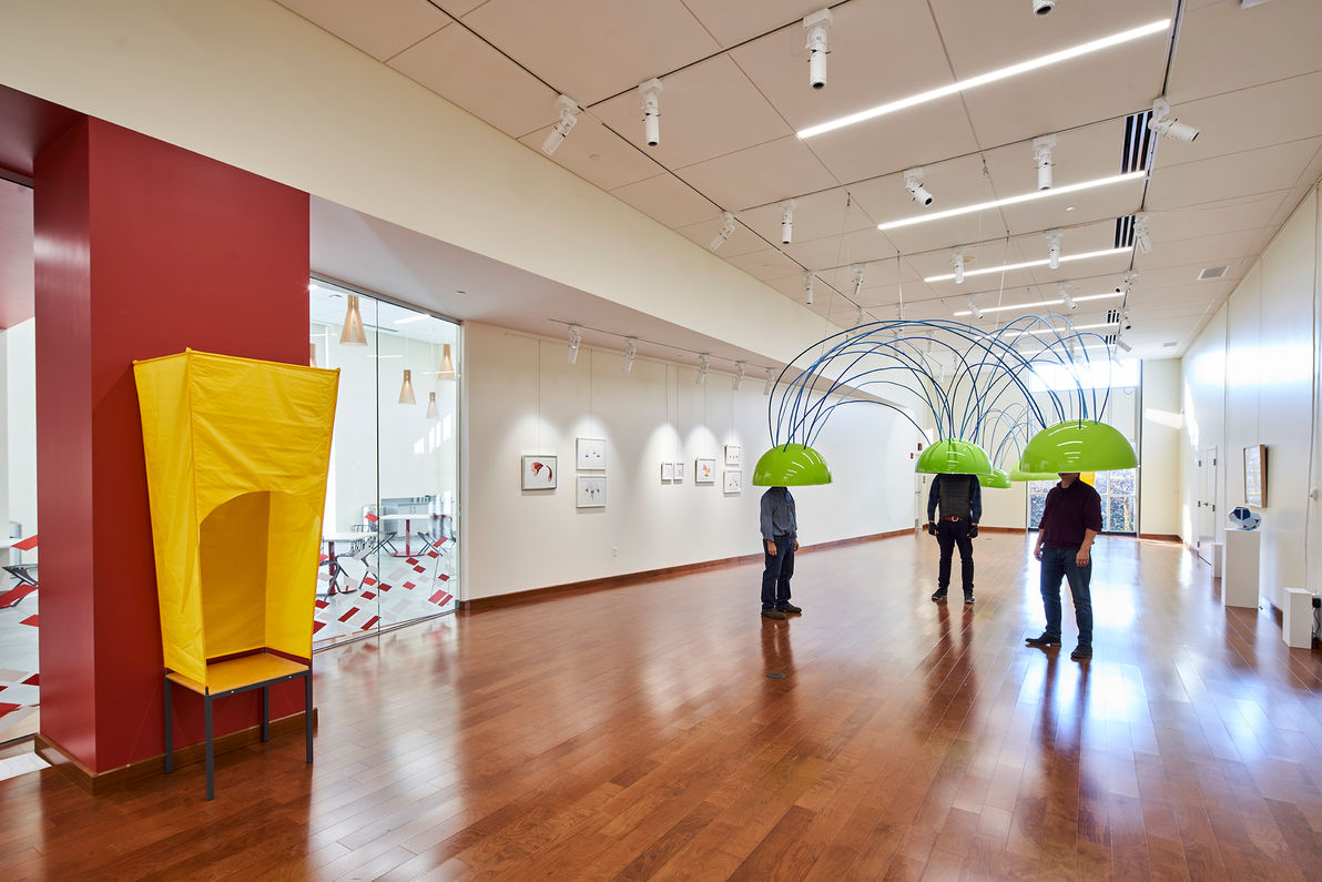 The Children’s Area has been fully re-vamped with new finishes, furniture, and lighting fixtures that have either been replaced or re-lamped. The collection layout has been reconfigured for improved browsing. The fixed service point has been reduced in size and a mobile service point has been added for flexible oversight during peak times. Highlights of this space include a Dr. Seuss gallery wall featuring original artwork and an interactive “mystery wall” engaging children in problem solving activities with visual and audio clues.