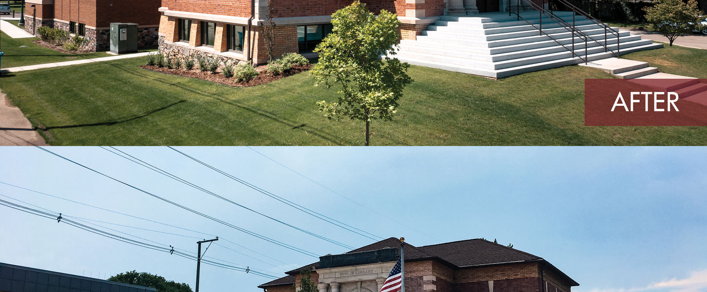 A restored façade brings new life to a Carnegie Library with removal of 1972 addition