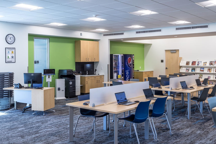 The Lucero Branch is located in an area with a strong community art presence and is heavily used. This project expanded the building as much as possible on its tight site, enclosed an existing porch for added space, and relocated the building entry to improve access and security. From the new entry, reorganized public spaces open to clear views and easy wayfinding. The service desk has been repositioned for improved oversight and staff work areas received a much-needed increase in space. The AMH system was replaced and tied into new interior and exterior book drops. The new meeting rooms are better equipped to provide after-school and summer programs and meals for children and teens. A new A/V recording studio extends access to technology and study nooks, rather than enclosed rooms, provide focused spaces with implied privacy.