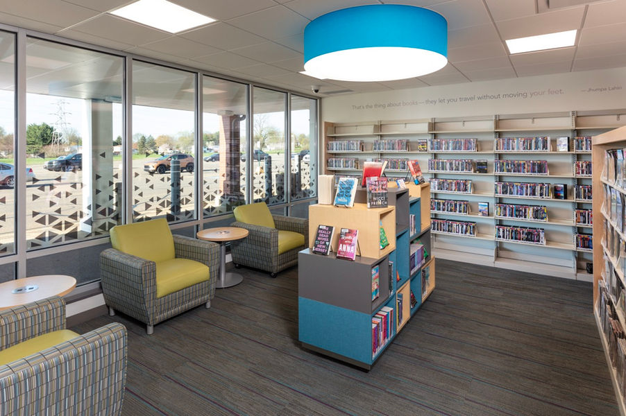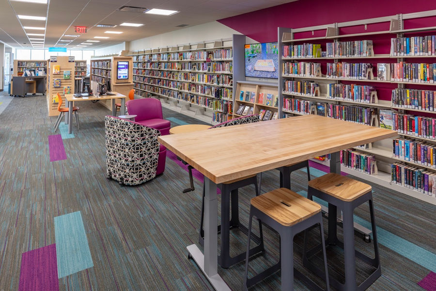 As a full-service branch, Southgate includes dedicated areas for adults, teens, and children, along with a study room and a meeting room. The layout and design were informed by usage patterns observed at other Re|Imagine branches, helping to fine-tune the size of spaces, collections, and technology offerings. In the children’s area, mobile shelving and furniture allow for flexible configurations that support a variety of programs and activities.