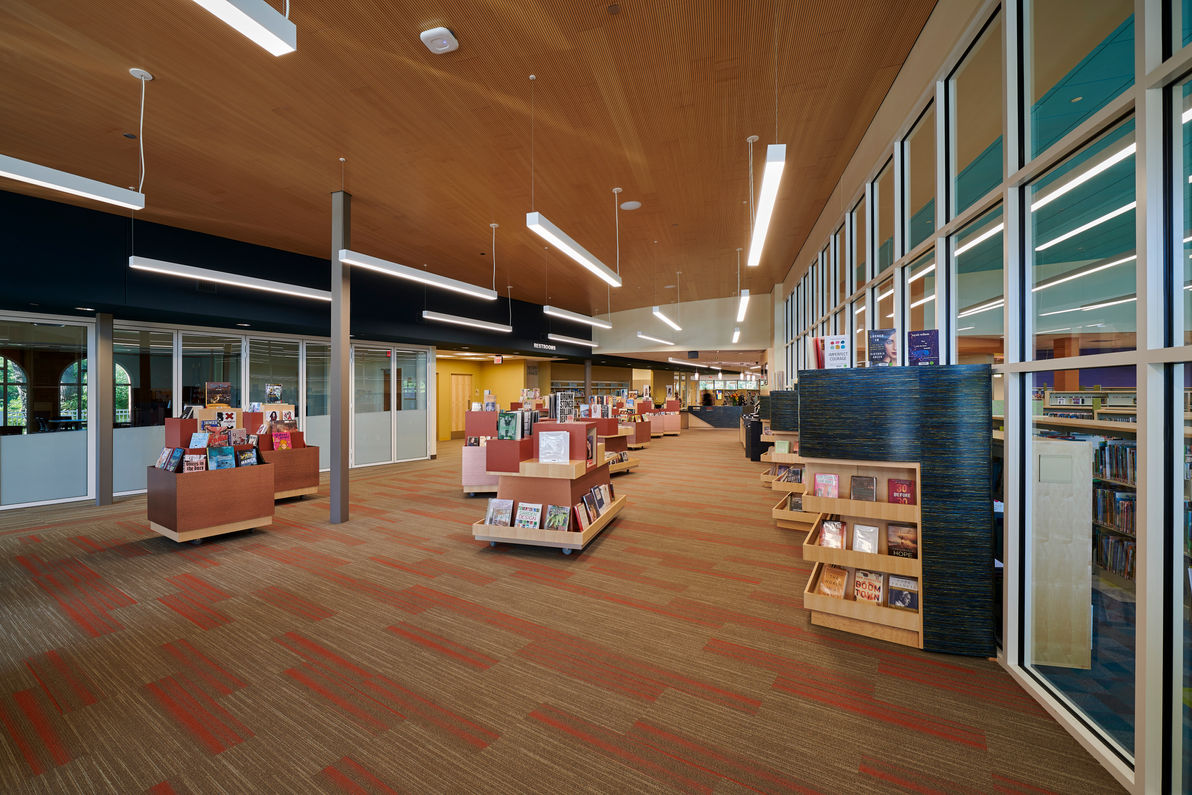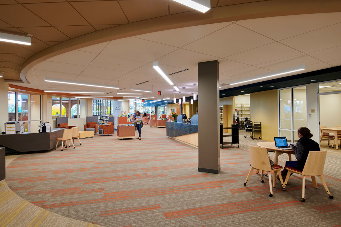 This project centers around two additions and the renovation of an existing 17,370 SF branch library that has distinguishable wings which house a children’s area in one and a large, flexible meeting room and cafe space in the other. A new East addition of a growing, curved glass facade provides a contemporary visual connector running North to South along the building. This also opens clear sight lines upon entry to the expanded Children’s Area, updated Meeting Room, Adult areas, Study Rooms, Staff Service Point, and new book displays. Passers-by and Library patrons now have more visibility into and out of the Library provided by the new glass facade, replacement of existing tinted glass, and opening up existing, hidden windows for more natural light.