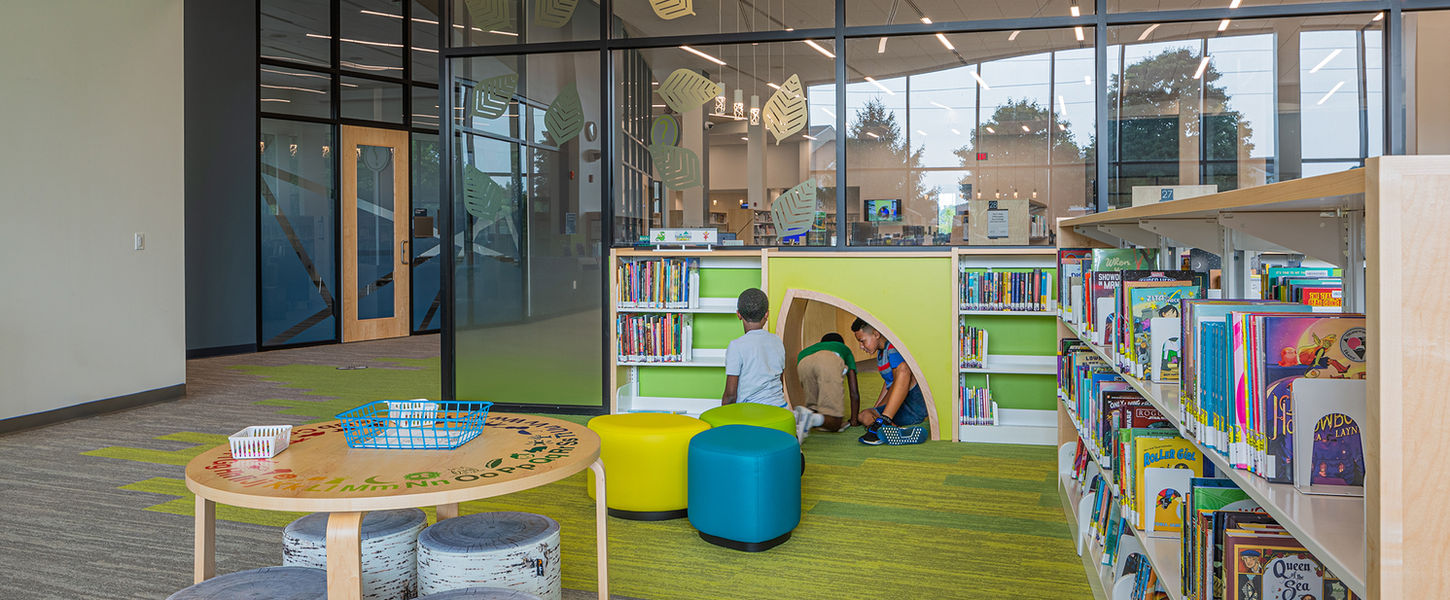 The children’s area is enclosed with a glass wall that provides oversight of the space as well as showcasing its activity to viewers both in and outside of the library. Natural forms are reinforced throughout this area beginning with dimensional leaves used to signify the entry, a leaf-shaped toddler crawl through, resin details on shelving that resemble grass, seedling seats, and interactive manipulative elements that are based on woodland creatures. The covered patio provides comfortable outdoor space for general patron use with fixed table and chair seating, while an area with benches is located adjacent to the children’s area for outdoor programs where children can interact with both storytime and the surrounding park-like environment.